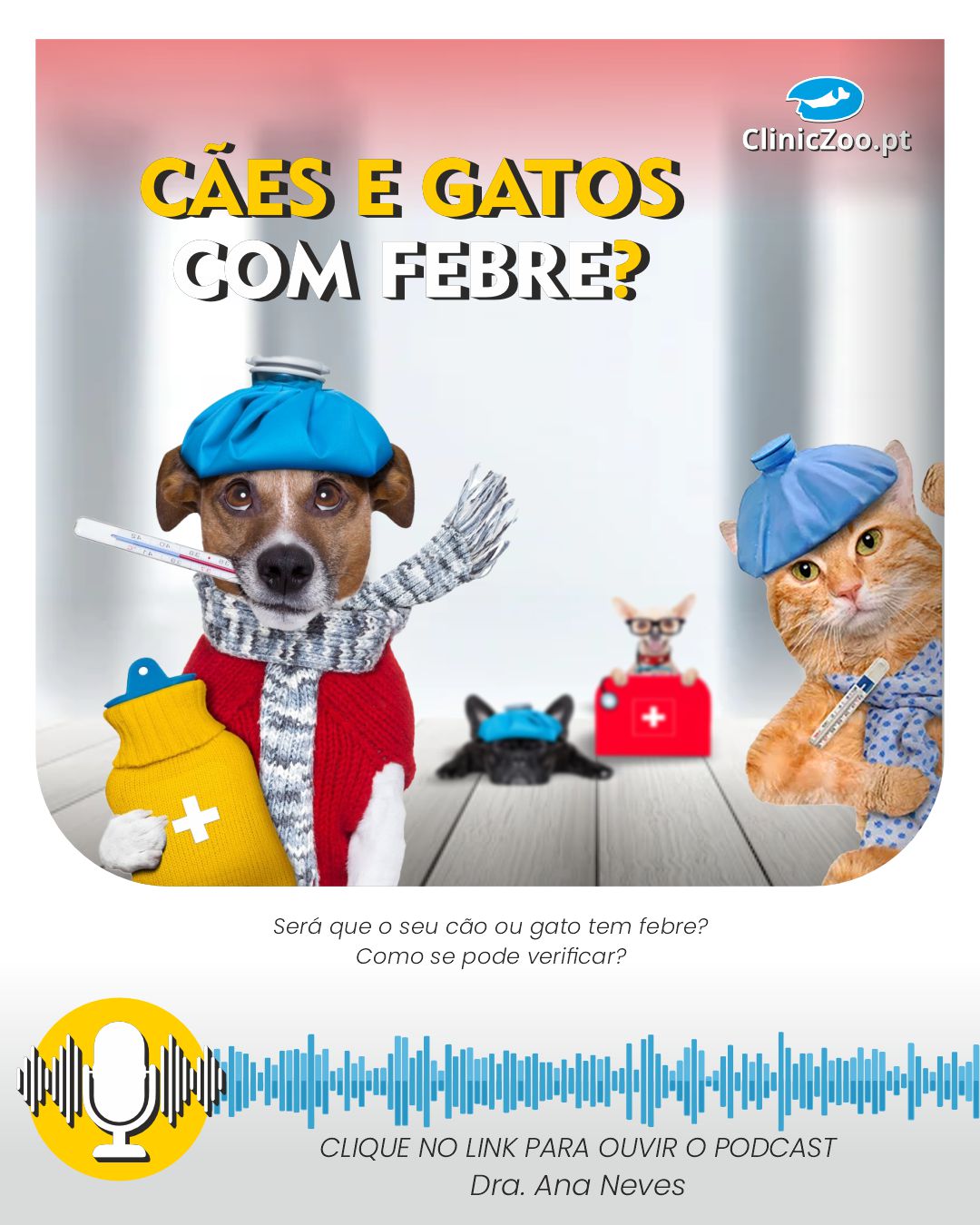 Olá a todos. O meu nome é Ana Neves, sou médica veterinária na ClinicZoo – Clínica Veterinária de Vagos. Bem vindos, a mais uma rubrica minutos vet. Esta semana vou falar sobre febre nos cães e nos gatos.
